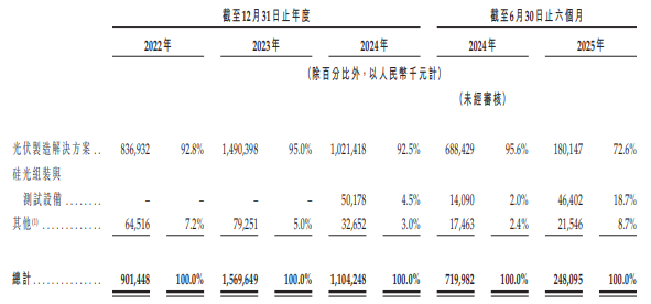 虽然战略收购进一步抬高了罗博特科的成长预期,但结合公司当前的业绩来看,眼下罗博特科显然正在急切等待业绩拐点的出现。拆分收入结构来看,罗博特科收入的大头主要由光伏制造解决方案贡献,2022年-2025年上半年,该业务的收入占比分别为92.8%、95%、92.5%、72.6%。在核心业务收入权重下滑的同一时间,罗博特科的硅光组装与测试设备业务则潜力初释,该业务从2024年才开始贡献收入,至今年上半年其业务占比已升至18.7%。