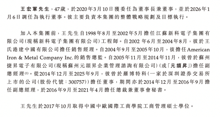 加入集团前,王宏军自1998年8月至2002年5月担任江苏新科电子集团有限公司(现称新科电子集团有限公司)工程师。自2002年6月至2004年8月,其于王氏港建中国有限公司担任销售经理。自2004年9月至2005年10月,其担任American Iron&Metal Company Inc.的销售总监。自2005年11月至2014年11月,其曾于苏州捷昇电子有限公司(现称苏州元颉昇企业管理谘询有限公司)(或“元颉昇”)担任副总经理。从2014年12月至2025年9月,其曾于罗博特科(股份代码:300757)担任董事,期间亦于2014年12月至2016年9月担任副总经理,于2016年9月至2021年4月担任总裁兼董事会秘书。