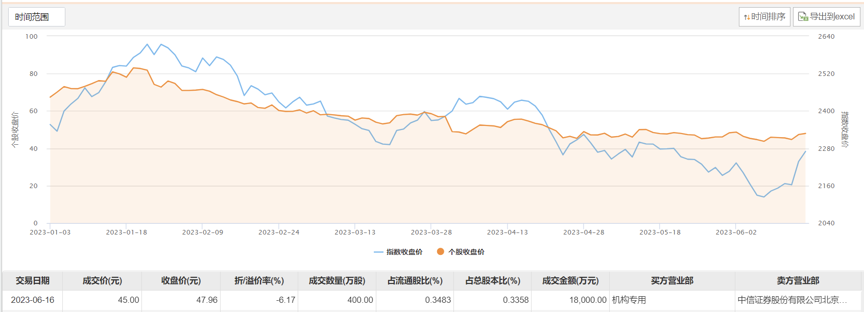 今日大宗交易成交400万股,成交额1.8亿元,占当日总成交额的17.11%,成交价45元,较市场收盘价折价6.17%。