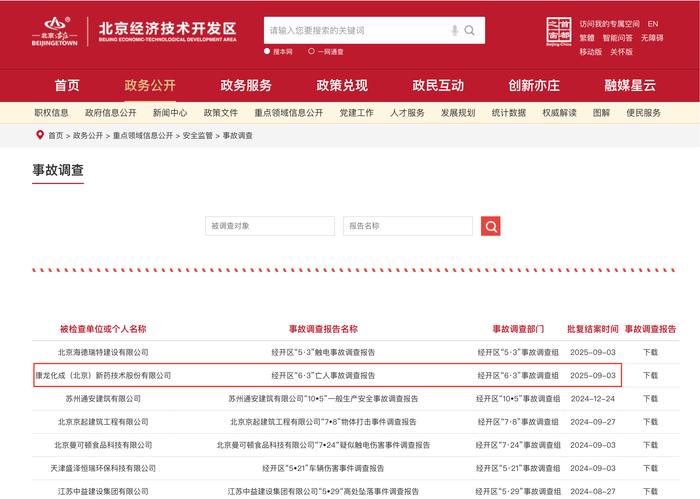 今年9月3日,北京经开区官网披露了《经开区“6·3”亡人事故调查报告》。上述调查报告披露,今年6月3日,康龙化成(300759.SZ)发生一起两人死亡事故。
