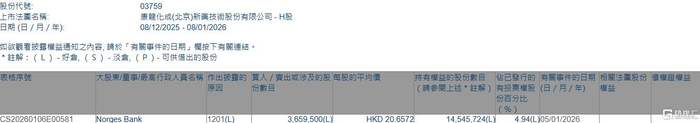 格隆汇1月8日丨根据联交所最新权益披露资料显示,2026年1月5日,康龙化成(03759.HK)遭Norges Bank在场内以每股均价20.6572港元减持365.95万股,涉资约7559.5万港元。