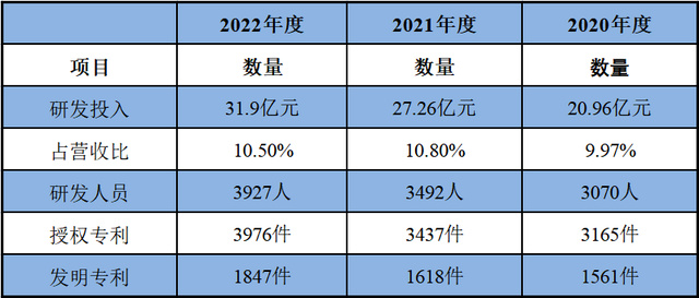 过去5年,迈瑞医疗在研发领域累计投入超过110 亿元。其中,2020年至2022年,迈瑞医疗研发投入从20.96亿元增长至31.9亿元,近两年占营收比例在10%以上。截至2022年底,迈瑞医疗共计申请专利8670件,其中发明专利6193件,共计授权专利3976件,其中发明专利授权1847件。最近3年,迈瑞医疗授权专利增长超800件,发明专利增长近300件。