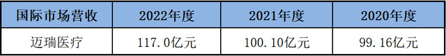 反映到业绩上,2022年,迈瑞医疗国际市场营收117.0亿元,同比增长16.9%,扣除抗疫相关产品后增长超30%。2020年以来,迈瑞医疗国际市场营收稳步增长,2021年突破百亿元大关,2022年在高基数基础上增速不减。显然,迈瑞医疗国际高端客户群突破,成为其打开国际市场营收增长空间的钥匙。