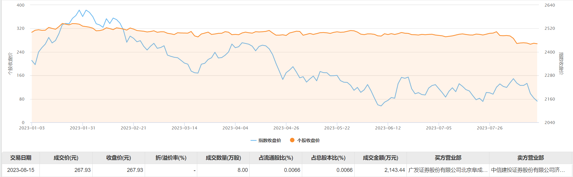 8月15日大宗交易成交8万股,成交额2143.44万元,占当日总成交额的1.71%,成交价267.93元,较市场收盘价267.93元持平。
