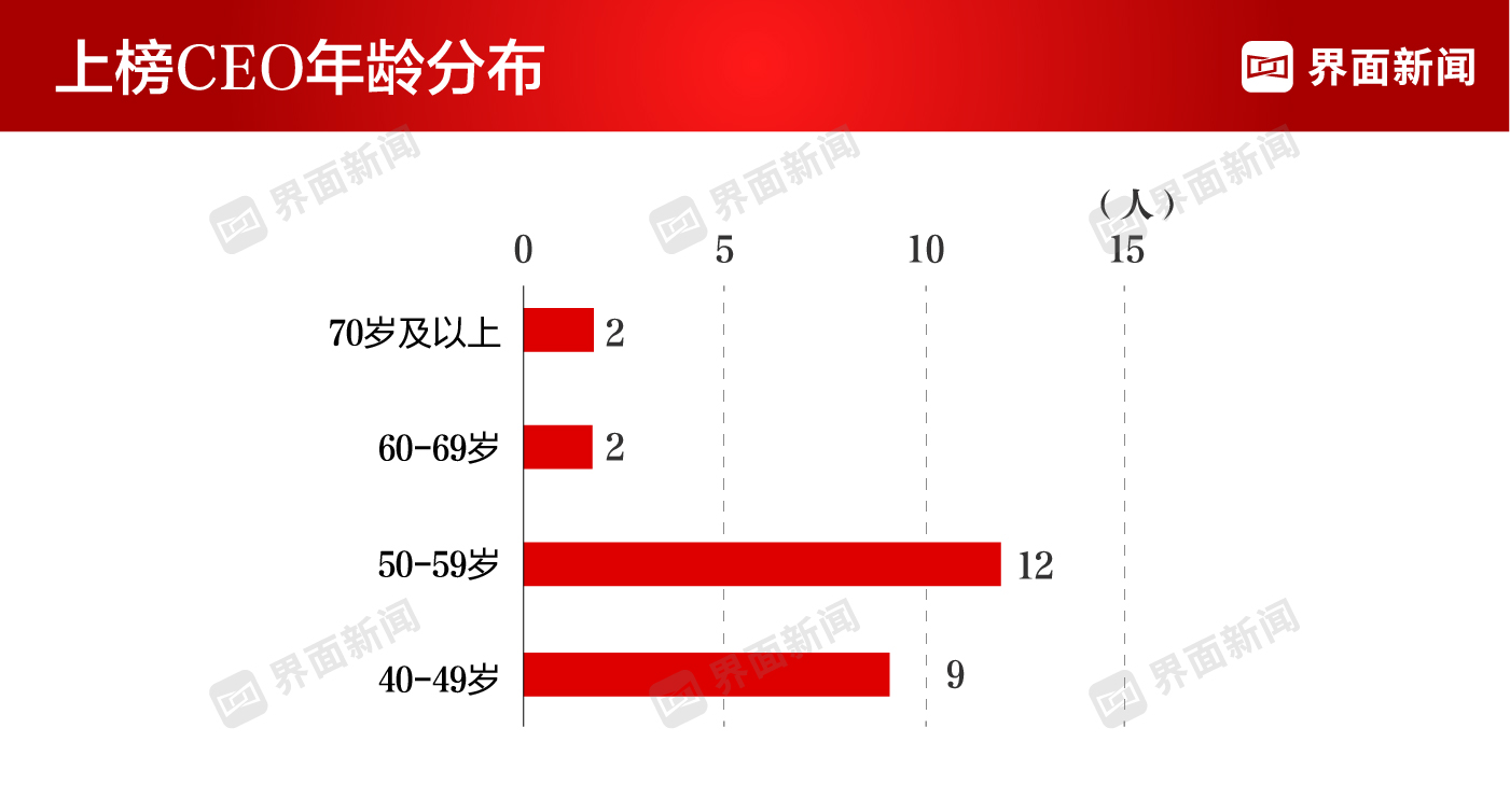 上榜的25位CEO平均年龄54岁,其中最年轻的当属京东健康的金恩林和普瑞眼科的孙强,今年同为42岁。上榜CEO中共有2位女性,她们分别是同仁堂总经理张朝华和兴齐眼药总经理高峨。