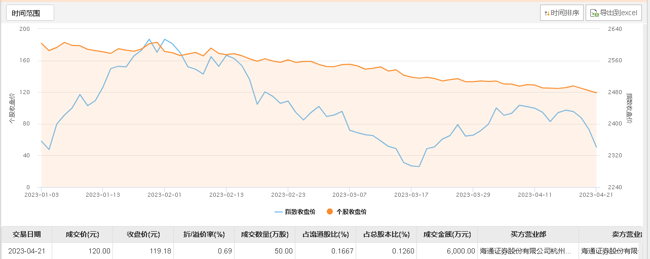 大宗交易成交50万股,成交额6000万元,占当日总成交额的7.53%,成交价120元,较市场收盘价119.18元溢价0.69%。