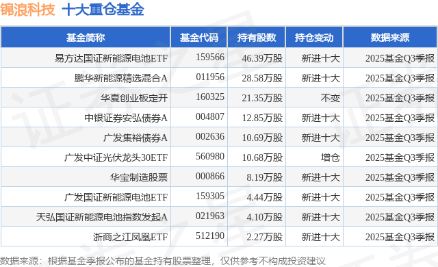 根据2025基金Q3季报公募基金重仓股数据,重仓该股的公募基金共17家,其中持有数量最多的公募基金为易方达基金的易方达国证新能源电池ETF。易方达国证新能源电池ETF目前规模为18.21亿元,最新净值2.0644(10月28日),较上一交易日下跌0.68%,近一年上涨50.82%。该公募基金现任基金经理为李栩。李栩在任的基金产品包括:易方达中证物联网主题ETF,管理时间为2022年11月26日至今,期间收益率为76.03%;易方达中证沪港深500ETF,管理时间为2022年12月3日至今,期间收益率为42.81%;易方达中证港股通互联网ETF,管理时间为2023年5月31日至今,期间收益率为61.22%;易方达中证2000ETF,管理时间为2023年9月13日至今,期间收益率为51.88%。
