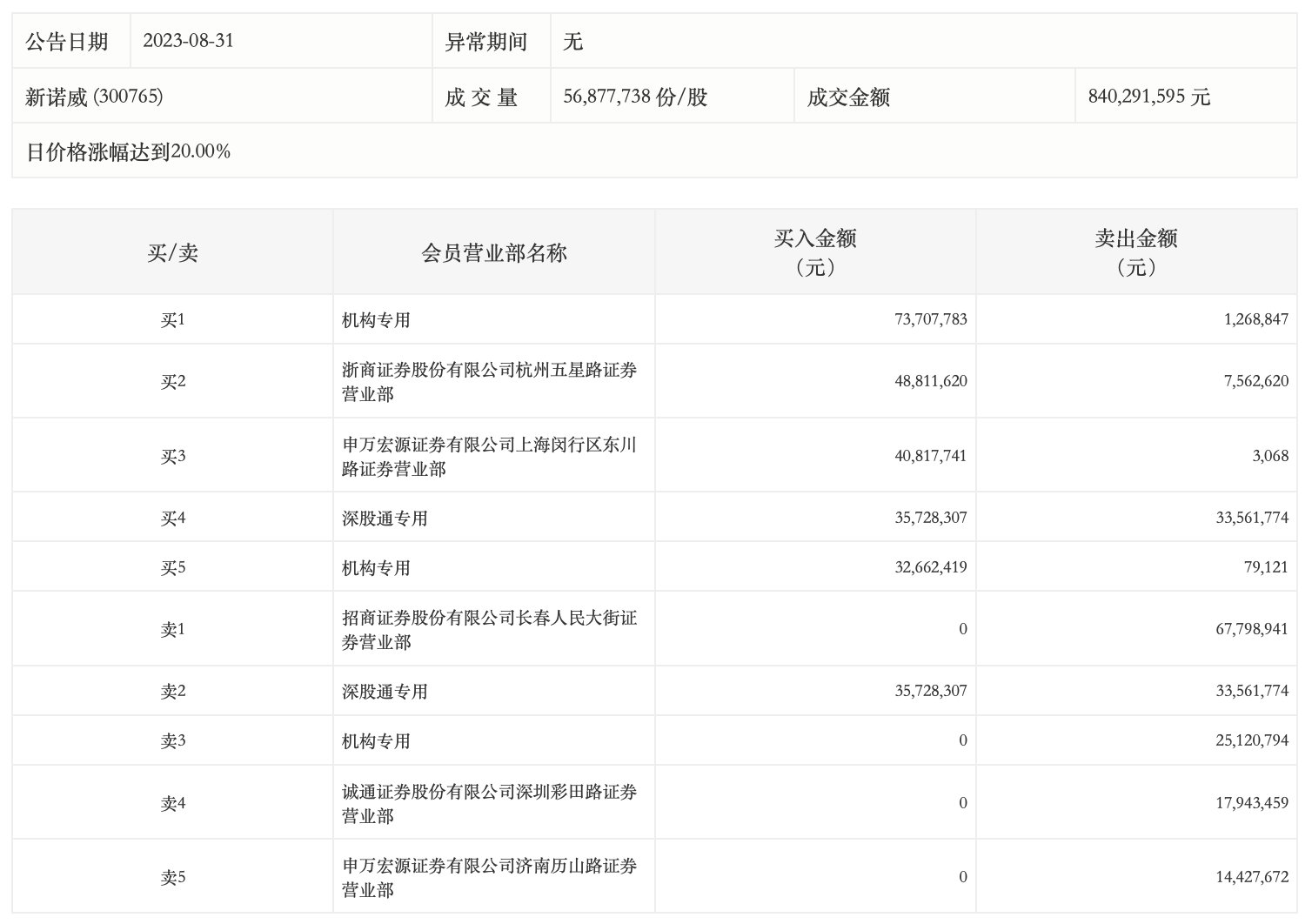 8月31日,新诺威今日20cm涨停,成交额8.40亿元,换手率5.79%,盘后龙虎榜数据显示,深股通专用席位买入3572.83万元并卖出3356.18万元,二机构净买入1.05亿元,一机构净卖出2512.08万元。