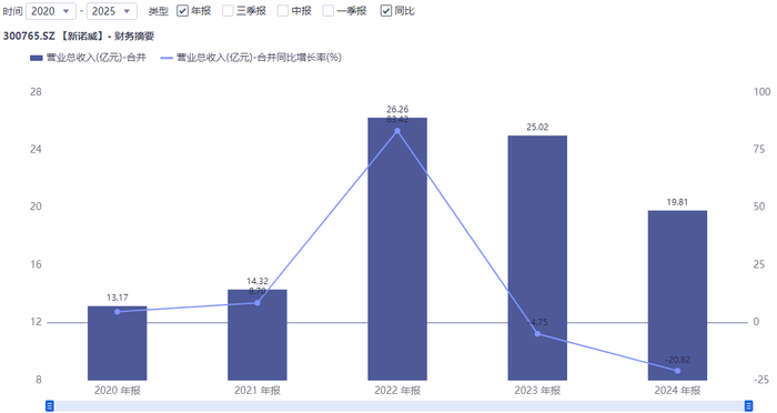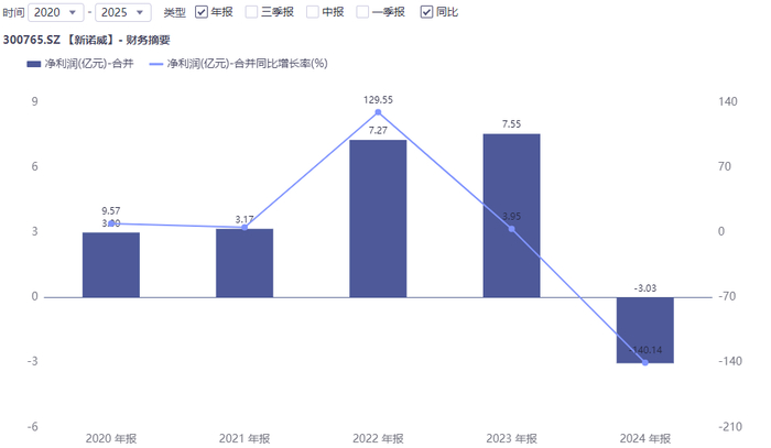 与此同时,新诺威业绩表现也明显承压。同花顺iFind数据显示,2022至2024年,该公司营收分别为28.38亿元、25.39亿元、19.81亿元,净利润分别为2.94亿元、1.26亿元、-3亿元。行至2025年业绩预告,新诺威更是出现上市以来首次扣非后年度亏损,扣非净利润为-2.1亿元至-3.15亿元,同比下滑596%至844%。