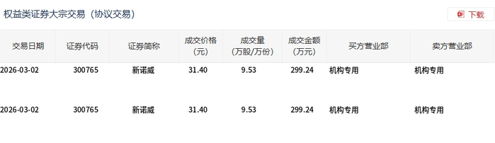 3月2日,新诺威大宗交易成交19.06万股,成交额598.48万元,占当日总成交额的1.84%,成交价31.4元,较市场收盘价31.4元持平。
