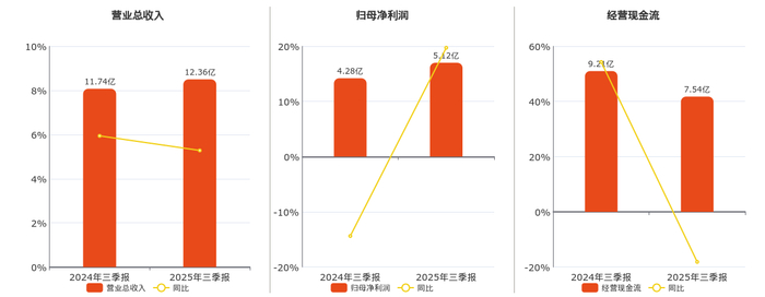 公司营业总收入为12.36亿元,较去年同报告期营业总收入增加6201.77万元,实现5年连续上涨,同比较去年同期上涨5.28%。归母净利润为5.12亿元,较去年同报告期归母净利润增加8430.00万元,同比较去年同期上涨19.72%。经营活动现金净流入为7.54亿元。