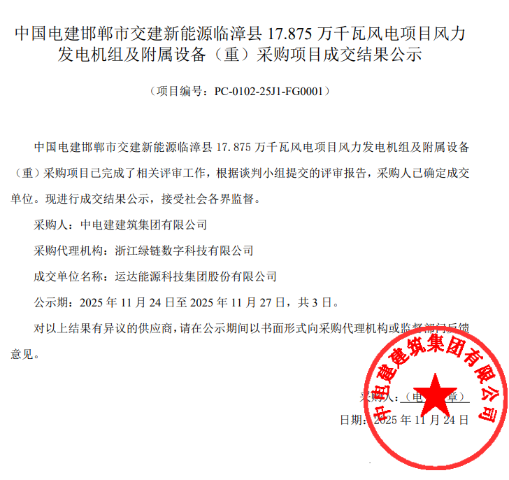 「风电之音」获悉,11月24日,中国电建邯郸市交建新能源临漳县17.875万千瓦风电项目风力发电机组及附属设备(重)采购项目成交结果公示。