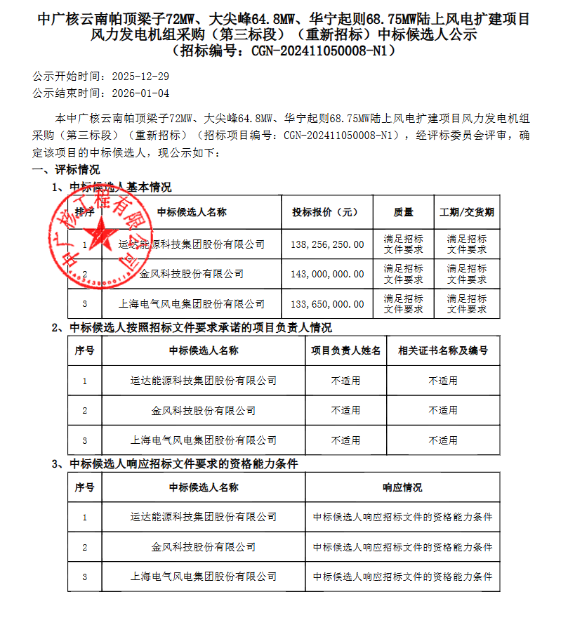 风芒能源获悉,12月30日,中广核云南帕顶梁子72MW、大尖峰64.8MW、华宁起则68.75MW陆上风电扩建项目风力发电机组(第三标段)重新招标中标候选人公示。