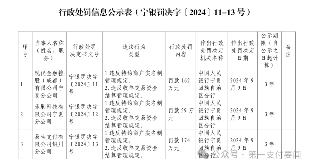 同样因上述两项原因,现代金控宁夏分公司、乐刷科技宁夏分公司及易生支付宁夏分公司分别被罚162万元、59万元及174万元。