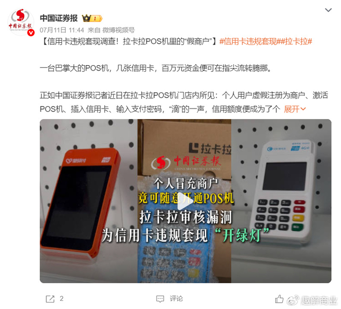 今年7月,据《中国证券报》报道,一些支付机构的门店内,个人用户无需实体经营资质,仅凭虚假信息就可完成商户注册,进而实现违规套现,国内知名第三方支付机构——拉卡拉也赫然在列。
