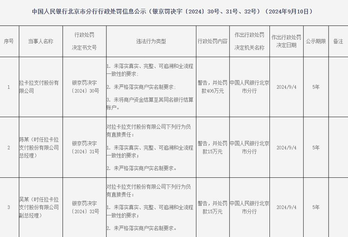 继续往前追溯,拉卡拉2023年也曾因未按照规定履行客户身份识别义务、未按规定报送大额交易报告或者可疑交易报告、与身份不明的客户进行交易被罚款875.4万元,时任公司副总裁吴某也被处以9.58万元罚款。