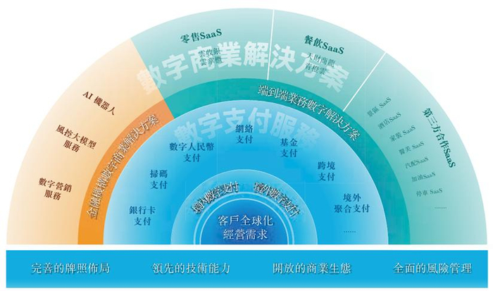 通过自研的科技体系,拉卡拉能够为中小商户和行业客户提供覆盖在线、线下、境内、境外的一站式支付解决方案,帮助客户处理不同商业场景、不同付款方式、不同交易币种的支付需求,实现全链路数字化经营。