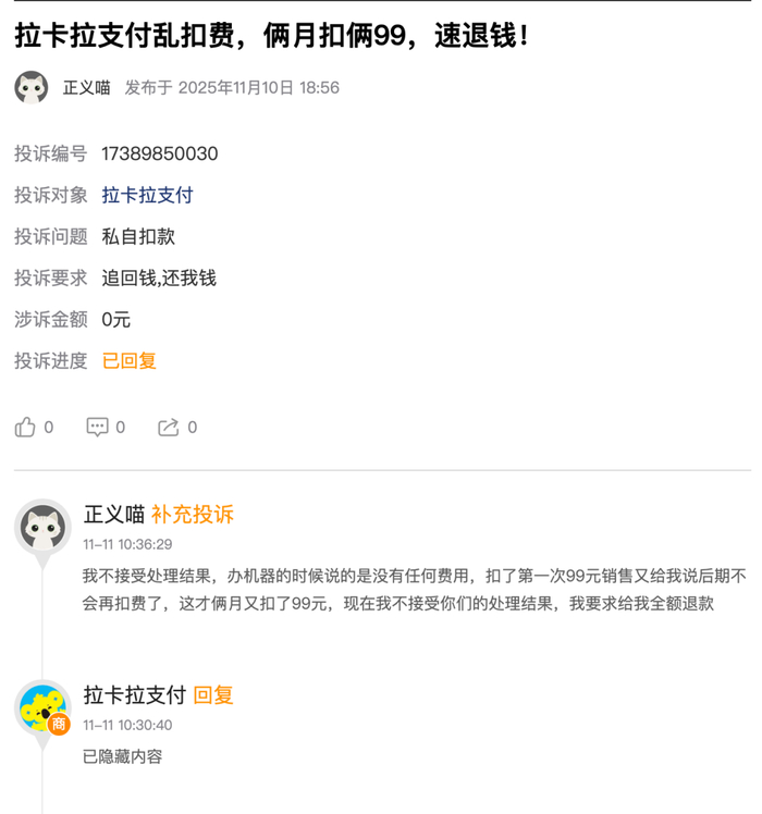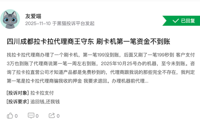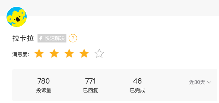 POS机押金不退、乱扣费、到账延迟……截至11月11日,在第三方投诉平台[下载黑猫投诉客户端]黑猫投诉上,以“拉卡拉”为关键字搜索,涉及投诉量近10万条,其中有95%显示已完成。近30天,新增投诉780条,平均每天26条,显示已完成的仅46条,占比不足6%,大部分仍在处理中。
