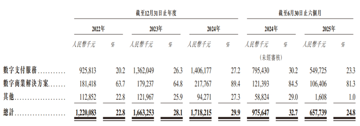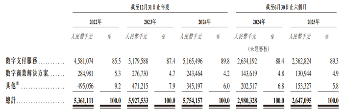 业务结构的单一,或许是拉卡拉业绩承压的重要原因。2022年-2024年以及2025年上半年(简称:报告期),拉卡拉的收入构成中,有85%以上来自数字支付服务的贡献,其中又以银行卡支付为核心;被寄予厚望的“第二引擎”数字商业解决方案,占比在5%上下徘徊,暂时未能扛起增长大旗,2025年上半年收入1.31亿元同比降8.8%,营收占比仅有4.9%。