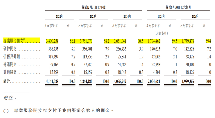 报告期内,拉卡拉的销售成本各期分别为41.41亿元、42.64亿元、40.35亿元、19.89亿元,其中支付给渠道合伙人的佣金占比分别为82.1%、88.2%、90.5%、89.4%。