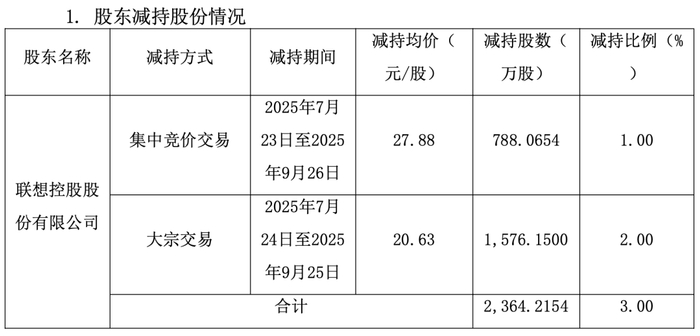 公告显示,此次联想控股减持的目的为自身业务安排及需要,减持股份的来源为首次公开发行前取得的股份及资本公积转增股本获得的股份。