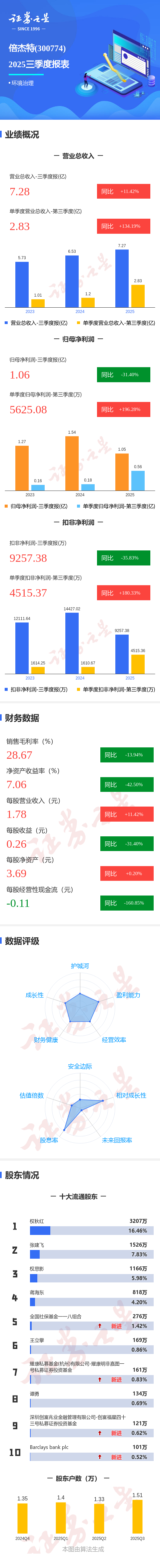证券之星消息,倍杰特2025年三季报显示,公司主营收入7.28亿元,同比上升11.42%;归母净利润1.06亿元,同比下降31.4%;扣非净利润9257.38万元,同比下降35.83%;其中2025年第三季度,公司单季度主营收入2.83亿元,同比上升134.2%;单季度归母净利润5625.08万元,同比上升196.29%;单季度扣非净利润4515.37万元,同比上升180.34%;负债率36.17%,投资收益502.21万元,财务费用-366.4万元,毛利率28.67%。