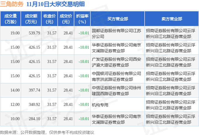 11月10日三角防务现7笔折价10.01%的大宗交易 合计成交2841万元