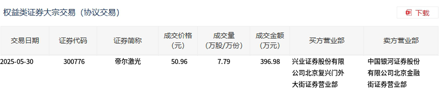 帝尔激光今日大宗交易折价成交7.79万股,成交额396.98万元