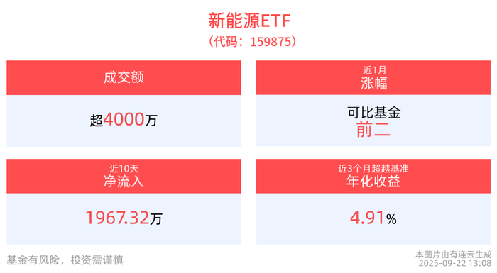 截至9月19日,新能源ETF近1年净值上涨58.12%。从收益能力看,截至2025年9月19日,新能源ETF自成立以来,最高单月回报为25.07%,最长连涨月数为4个月,最长连涨涨幅为31.31%,上涨月份平均收益率为8.03%。