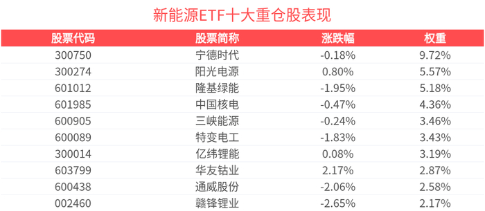 数据显示,截至2025年8月29日,中证新能源指数前十大权重股分别为宁德时代、阳光电源、隆基绿能、中国核电、特变电工、亿纬锂能、华友钴业、三峡能源、通威股份、天齐锂业,前十大权重股合计占比42.78%。