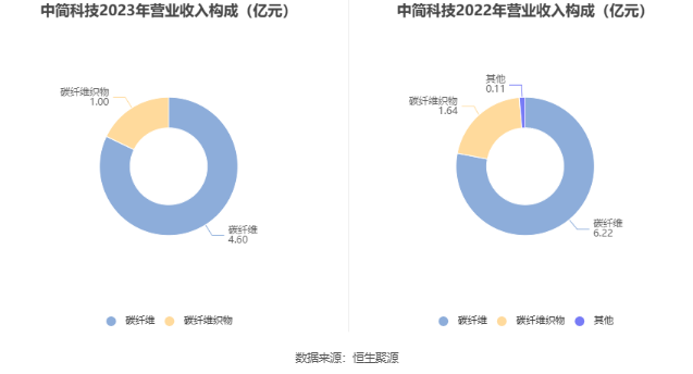 分产品来看,2023年公司主营业务中,碳纤维收入4.60亿元,同比下降25.98%,占营业收入的82.37%;碳纤维织物收入1.00亿元,同比下降38.99%,占营业收入的17.89%。