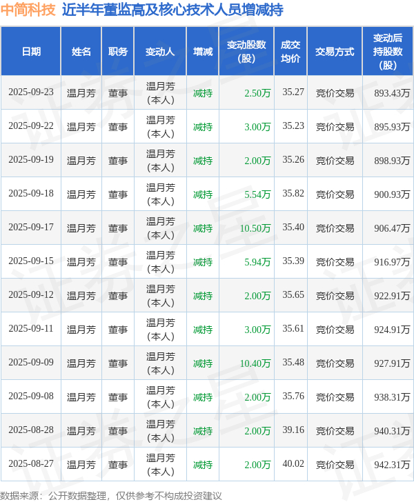 中简科技近半年内的董监高及核心技术人员增减持详情如下: