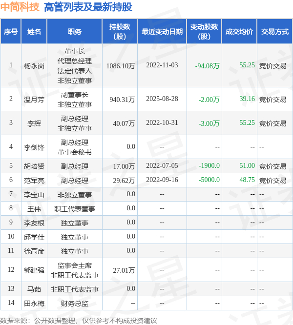 中简科技近半年内的董监高及核心技术人员增减持详情如下: