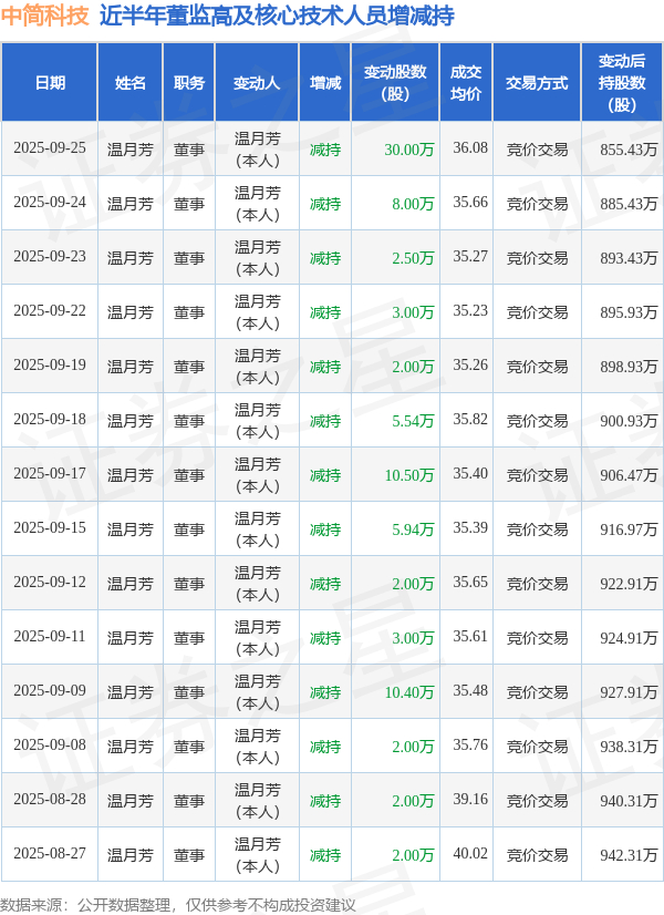 中简科技:9月25日高管温月芳减持股份合计30万股