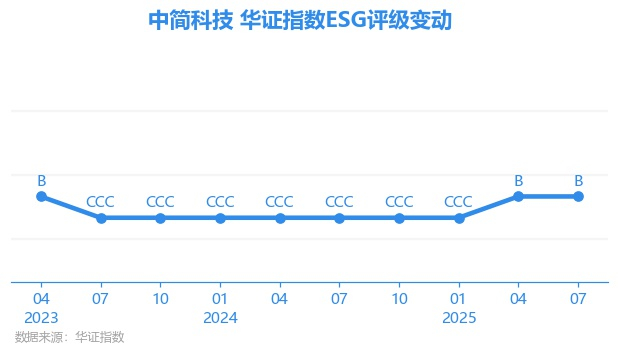 日前,华证指数公布了新一期(2025年7月31日)的ESG评级结果,中简科技(300777.SZ)获得B评级(华证指数评级为C起至AAA九档,C为最低档,AAA为其最高一级评级/AA为其第二档),上一期(2025年4月30日)ESG评级为B。本期ESG评级在462家化学制品行业A股上市公司中排名第210(上一期排名第203)。