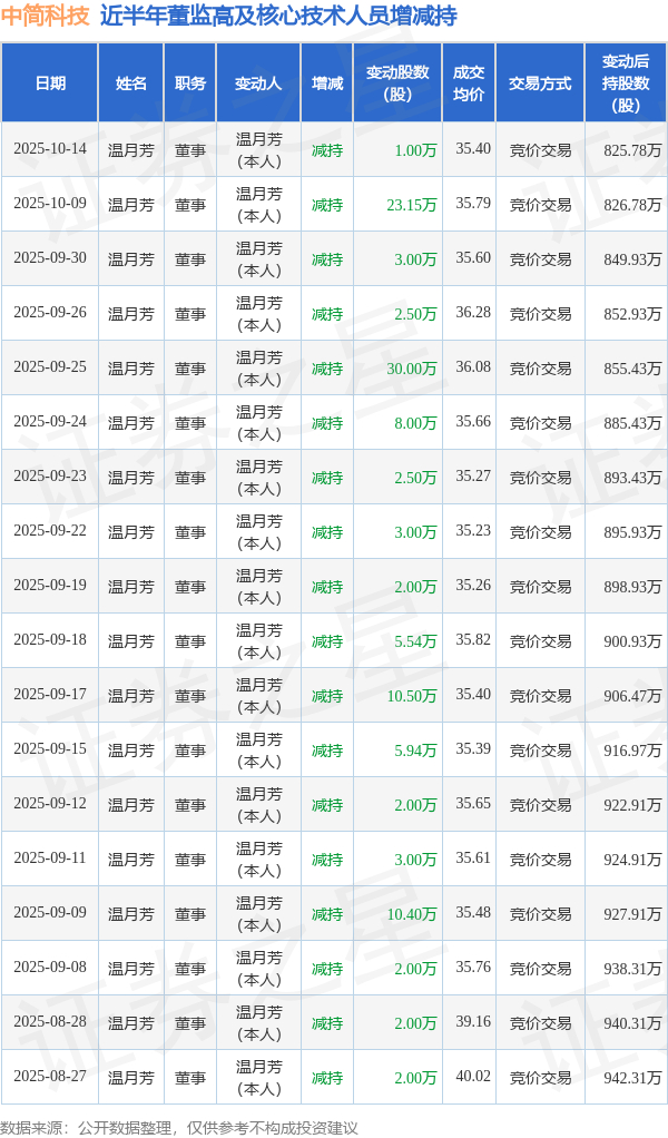 证券之星消息,根据10月15日市场公开信息、上市公司公告及交易所披露数据整理,中简科技(300777)最新董监高及相关人员股份变动情况:2025年10月14日公司董事温月芳共减持公司股份1.0万股,占公司总股本为0.0023%。变动期间公司股价下跌3.1%,10月14日当日收盘报34.35元。