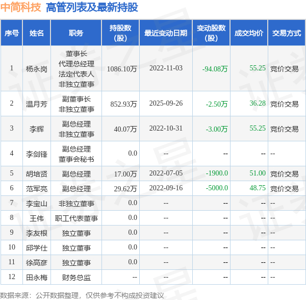 中简科技近半年内的董监高及核心技术人员增减持详情如下: