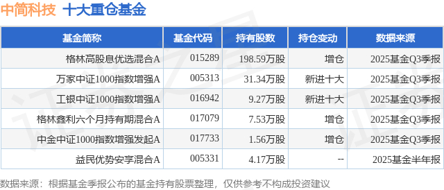 根据2025基金Q3季报公募基金重仓股数据,重仓该股的公募基金共5家,其中持有数量最多的公募基金为格林基金的格林高股息优选混合A。格林高股息优选混合A目前规模为1.36亿元,最新净值1.8556(1月15日),较上一交易日下跌0.64%,近一年上涨61.01%。该公募基金现任基金经理为刘赞。刘赞在任的基金产品包括:格林碳中和主题混合A,管理时间为2023年1月19日至今,期间收益率为82.25%;格林鑫利六个月持有期混合A,管理时间为2023年3月20日至今,期间收益率为25.59%;格林港股通臻选混合A,管理时间为2024年4月22日至今,期间收益率为44.41%。