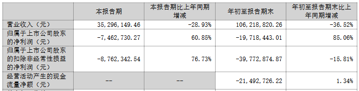 2025年1-9月,公司实现营业收入1.06亿元,同比下降36.52%;归属于上市公司股东的净利润为-1,971.84万元,上年同期为-13,197.67万元;归属于上市公司股东的扣除非经常性损益的净利润为-3,977.29万元,上年同期为-3,434.30万元;经营活动产生的现金流量净额为-2,149.27万元,同比增长1.34%。
