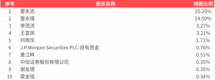 公司股东户数为2.22万户,前十大股东持股数量为6638.06万股,占总股本比例为45.26%,前十大股东持股情况如下:
