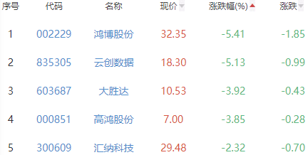 鸿博股份、云创数据、大胜达、高鸿股份和汇纳科技位列涨幅榜后五位,涨幅分别为-5.41%、-5.13%、-3.92%、-3.85%和-2.32%。
