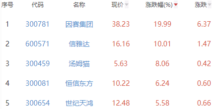 其中,因赛集团、信雅达、汤姆猫、恒信东方和世纪天鸿位列板块涨幅前五位,涨幅分别为19.99%、10.01%、8.06%、6.24%和5.58%。