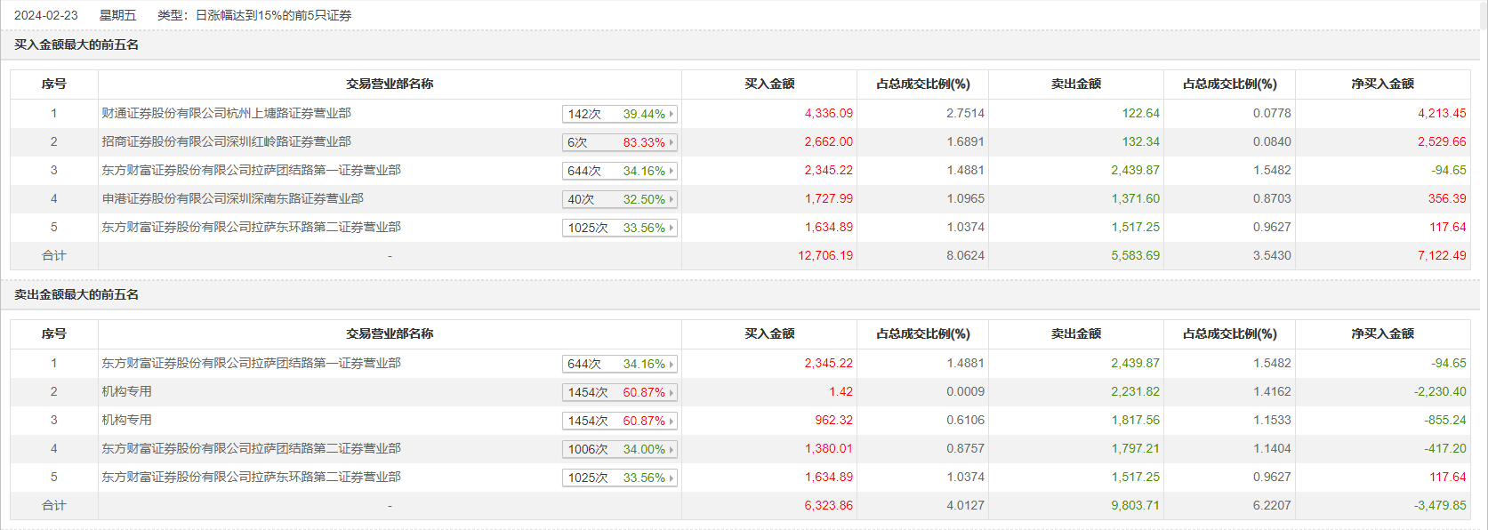 2月23日,因赛集团今日涨停,龙虎榜数据显示,上榜营业部席位全天成交2.65亿元,占当日总成交金额比例为16.8%。其中,买入金额为1.5亿元,卖出金额为1.14亿元,合计净买入3619.65万元。