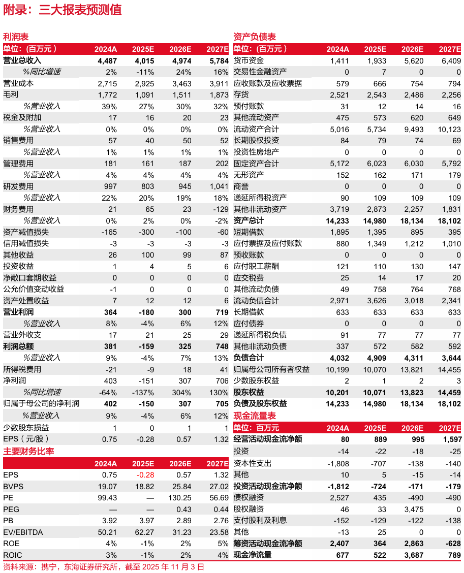 投资建议:短期内受射频前端市场竞争加剧、需求复苏不及预期及芯卓产线前期大幅折旧拖累,业绩有所承压,但环比已有边际向好趋势,后续随着产能利用率继续爬坡,有望逐步回归盈利水平。我们预计公司2025、2026、2027年营收分别为40.15、49.74、57.84亿元(2025、2026、2027年原预测值分别是47.85、52.36、59.29亿元),预计公司2025、2026、2027年归母净利润分别为-1.50、3.07、7.05亿元(2025、2026、2027年原预测值分别是5.87、9.88、13.53亿元),当前市值对应2026、2027年PE为130、57倍。盈利预测维持“买入”评级。