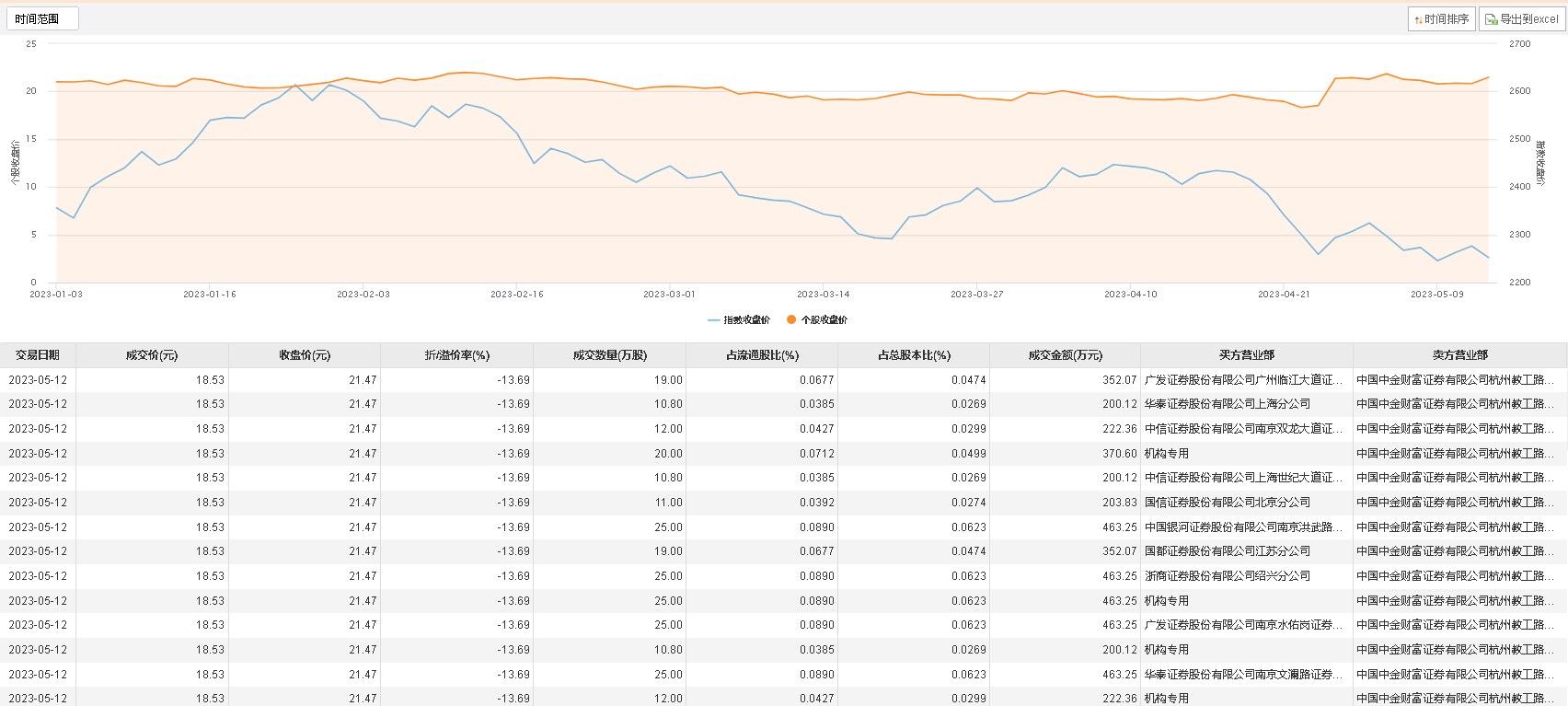 大宗交易成交250.4万股,成交额4639.9万元,占当日总成交额的15.49%,成交价18.53元,较市场收盘价21.47元折价13.69%。