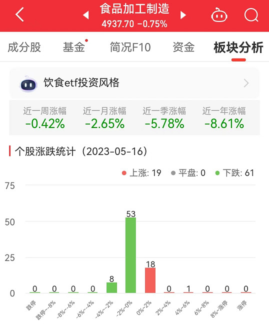 中国经济网北京5月16日讯 今日,食品加工制造板块整体跌幅0.75%,其中,19只股票上涨,61只股票下跌。