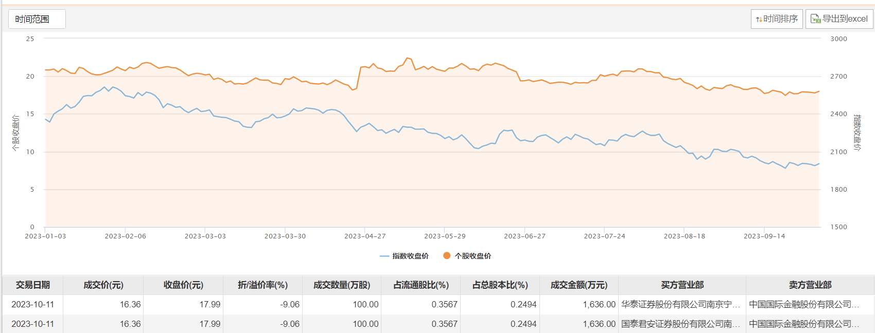 今日大宗交易成交200万股,成交额3272万元,占当日总成交额的43.67%,成交价16.36元,较市场收盘价折价9.06%。
