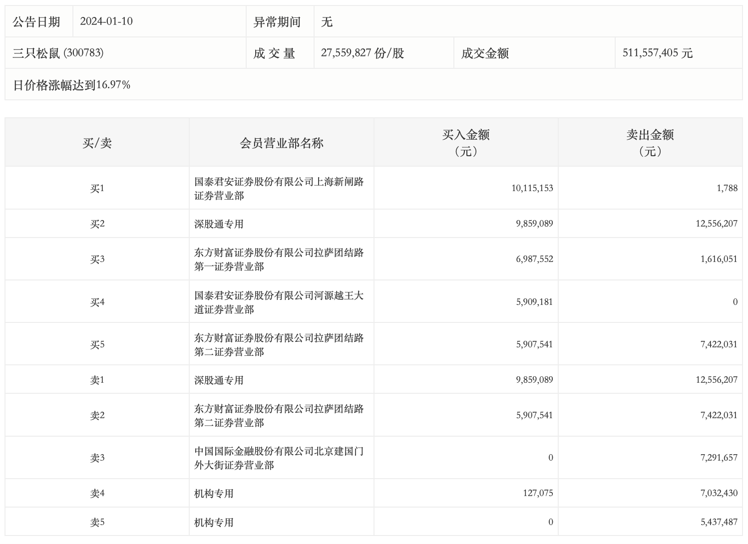 1月10日,三只松鼠今日涨16.97%,全天换手率达9.83%,振幅达21.98%。龙虎榜数据显示,营业部席位合计净卖出245.21万元。其中,机构买入12.71万元,卖出1246.99万元,合计净卖出1234.28万元。此外,国泰君安证券上海新闸路证券营业部、深股通专用分别买入1011.52万元、985.91万元;深股通专用、东方财富证券拉萨团结路第二证券营业部分别卖出1255.62万元、742.20万元。