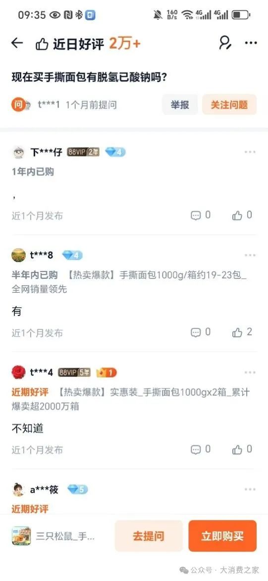 数据来源:淘宝APP对于食品添加剂的问题,消费者也十分关切。在淘宝旗舰店的“问大家“功能区,第一条就是消费者提问关于购买手撕面包是否还含有脱氢乙酸钠的问题。多数消费者出于对三只松鼠品牌的信赖没有仔细查验成分表,但是部分曾下单过手撕面包的网友回复说“有”。