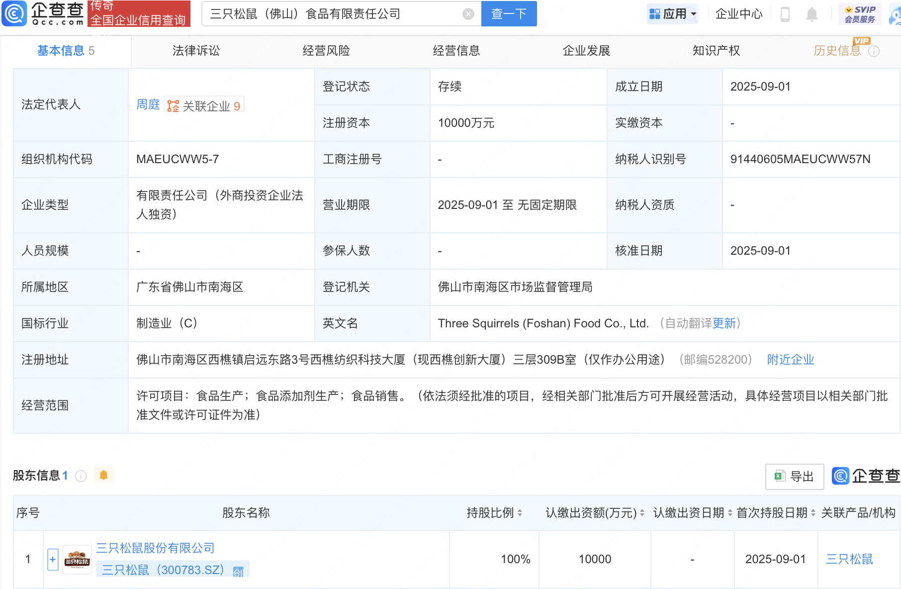 企查查APP显示,近日,三只松鼠(佛山)食品有限责任公司成立,注册资本1亿元,经营范围包含:食品生产;食品添加剂生产;食品销售。企查查股权穿透显示,该公司由三只松鼠(300783)全资持股。